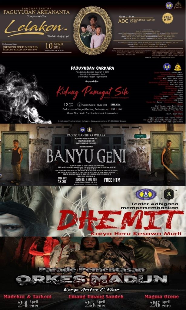 Di kampus S1-nya Bapak Rektor, selain menggandrungi bidang akademis, mahasiswa FBS terkenal atas kreatifitasnya yang tumpah ruah. Potensi ini dibidik setiap prodi sehingga pada April 2019 mampu menghasilkan 15 hal yang wajib untuk dilirik. Ialah 15 pementasan teater yang dapat mengalihkan sejenak pandangan mahasiswa dari asyiknya belajar untuk ujian mid semester dan persiapan micro teaching mahasiswa semester senja.