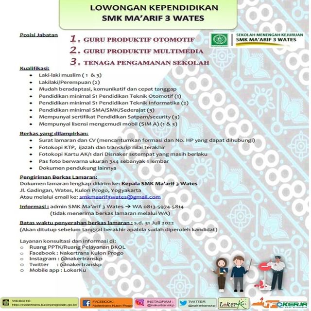 Dokumen lamaran lengkap dikirim ke: Kepala SMK Ma’arif 3 Wates