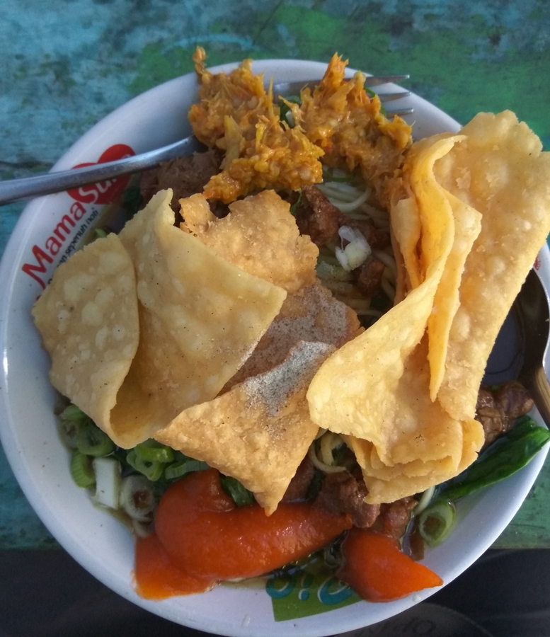 “Jangan kau dustai kuliner ini. Setiap sruputan beserta gulungan mi kuningnya sontak membuatmu melayang ke langit 7. Kalau kau mengunyah pangsit goreng, usahkan belum terlalu basah, mulutmu bisa mengeluarkan bebunyian kriuk-kriuk-kriuk yang menambah gairah dahar.”