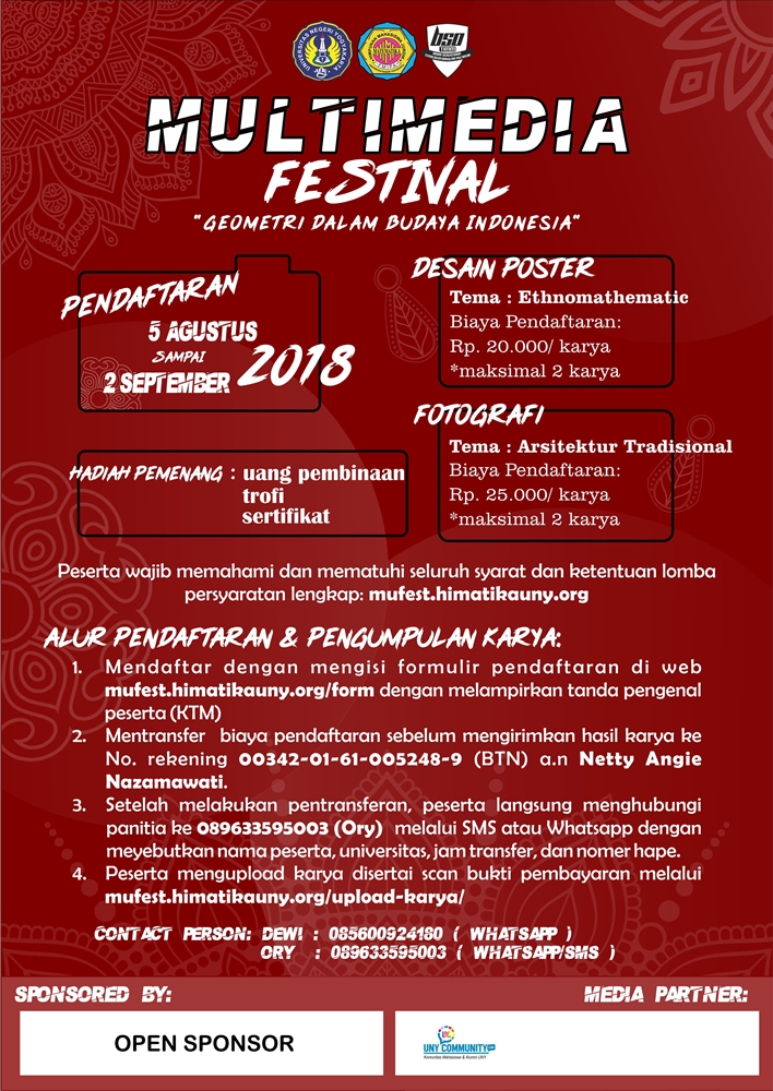 #MultimediaFestival2018 # MuFest2018 #MultimediaFestival #GeometridalamBudayaIndonesia #lombamahasiswa #lombadesainposter #lombafotografi #EventMahasiswa #matematika #explorejogja #eventjogja #acarajogja #infojogja #jogjatoday #kotajogja #fotografidesain #fotografi #desainposter #fotografijogja #infoseni #eventjogjakarta #opendonatur #opensponsor #opensponsorship #jogjainfo #wondefuljogja #unycommunity