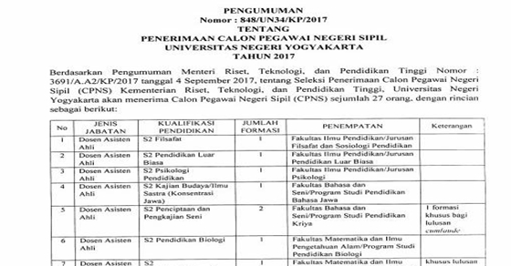 Universitas Negeri Yogyakarta membuka kesempatan kepada Warga Negara Indonesia yang berintegritas dan berdedikasi tinggi untuk diangkat menjadi Galon Pegawai Negeri…