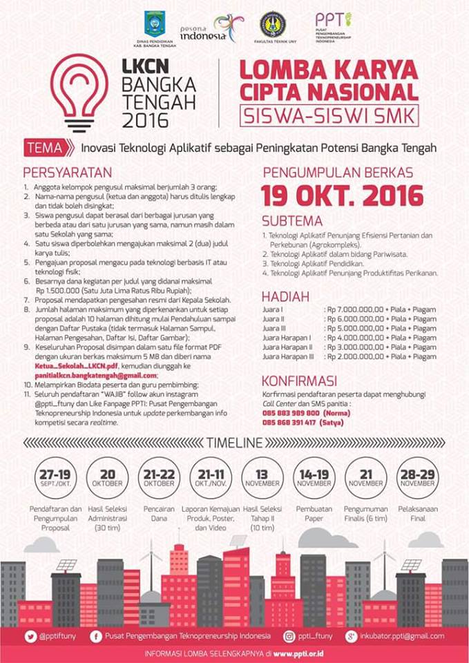 Dinas Pendidikan Kabupaten Bangka Tengah dan Pusat Pengembangan Teknopreneurship Indonesia (PPTI FT UNY) mempersembahkan Lomba Karya Cipta Nasional Tingkat SMK…