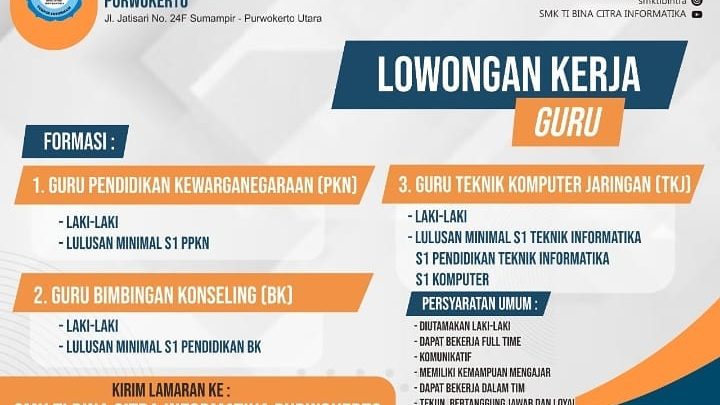 Ayooo.. bergabunglah bersama SMK TI Bina Citra Informatika. Dibutuhkan Guru : 1. Guru PKn 2. Guru BK 3. Guru Teknik Komputer Jaringan (TKJ) di Utamakan laki-laki, menguasai sesuai bidang, dan diutamakan memiliki kemampuan mengajar, dan dapat bekerja secara full time.. Kirim Lamaran ke SMK TI Bina Citra Informatika Jl. Jatisari No. 24F Sumampir (Utara SMP 9 Purwokerto)