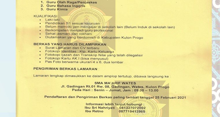 LOWONGAN KERJA GURU / PENGAJAR Membutuhkan karyawan untuk posisi: GURU OLAHRAGA/PENJASKES GURU BAHASA INGGRIS GURU KIMIA Kualifikasi: Laki-laki Pendidikan S1 sesuai kejuruan Belum memiliki jam mengajar di sekolah lain (Belum Induk di sekolah lain) Berkomitmen menjadi guru profesional Sehat jasmani dan rohani Diutamakan yang berdomisili di Kabupaten Kulon Progo Berkas Yang Harus Dilampirkan : Surat lamaran dan CV terbaru Foto copy identitas (KTP) dan Kartu Keluarga Fotokopi ijazah terakhir dan transkrip nilai (dilegalisir) Pas foto…