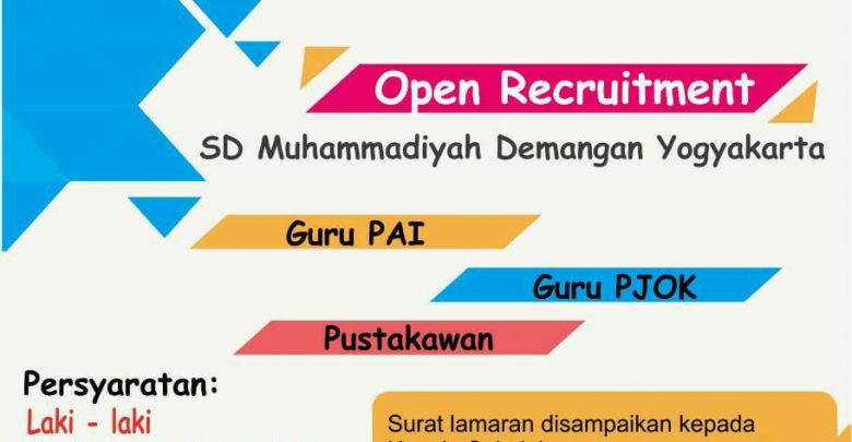 Membuka recruitment untuk posisi : Guru PAI Guru PJOK Pustakawan dengan persyaratan sebagai berikut : Laki laki memiliki ertos kerja tinggi Pendidikan S1 yang relevan Sehat jasmani dan rohani surat lamaran disampaikan kepada kepala sekolah SD MUHAMMADIYAH DEMANGAN YOGYAKARTA paling lambat tanggal 15 januari 2021