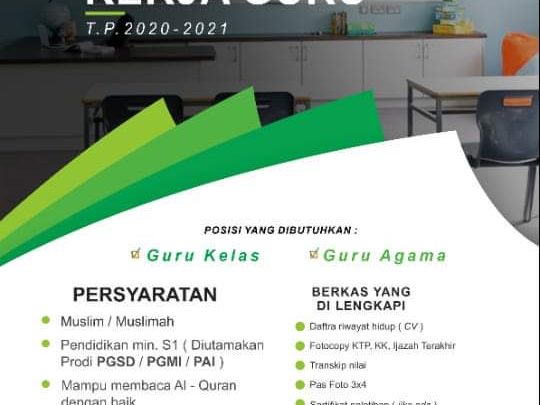 Madrasah Ibtidaiyah AL-JAILANI Posisi yang di butuhkan : Guru kelas Guru agama Dengan Persyaratan sebagai berikut: Muslim / Muslimah Pendidikan min.S1 (Diutamakan Prodi PGSD/PGMI/PAI) Mampu membaca Al-Quran dengan baik Usia maksimal 30 Tahun Siap mengikuti peraturan yayasan Dapat Berkomunikasi dengan baik kepada anak Mampu berkerja dalam tim Berkas yang harus di lengkapi yaitu: Riwayat Hidup (CV) Fotocopy KTP,KK,Ijazah Terakhir Transkip nilai Pas foto 3×4 Sertifikat pelatihan (jika ada) Kirimkan berkas lamaran lengkap ke alamat kami…