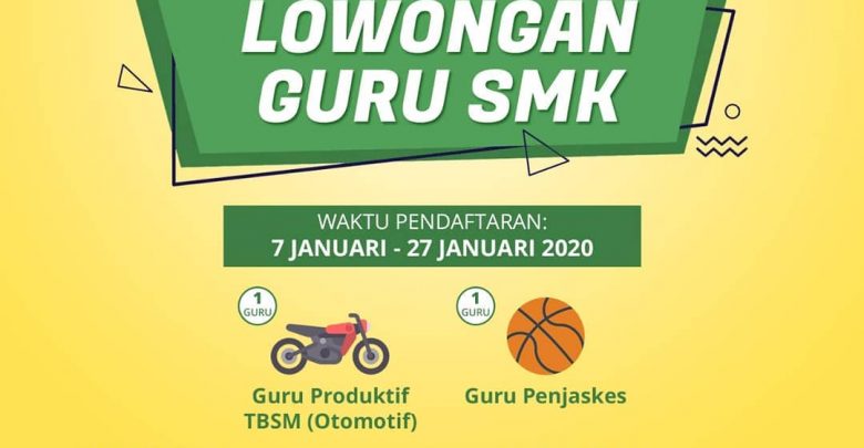 “LOWONGAN PEKERJAAN GURU” SMK MuhammadiyahBangunjiwo, merupakan Sekolah Menengah Kejuruan Swasta yang sudah Terakreditasi “B”, dengan visi Unggul, Mandiri, Islami yang saat ini memiliki Kompetensi Keahlian (Teknik Bisnis Sepeda Motor dan Tata Busana) memberikan kesempatan bagi calon Guru untuk bergabung dengan posisi sebagai: 1. Guru Produktif TBSM Otomotif Sepeda Motor (Laki-Laki, 1 Orang) – Pendidikan minimal S1 Pendidikan Teknik Mesin/Otomotif 2. Guru Penjasken/Olahraga (Laki-Laki, 1 Orang) – Pendidikan minimal S1 Pendidikan Olahraga PERSYARATAN UMUM: 1. Laki-Laki…