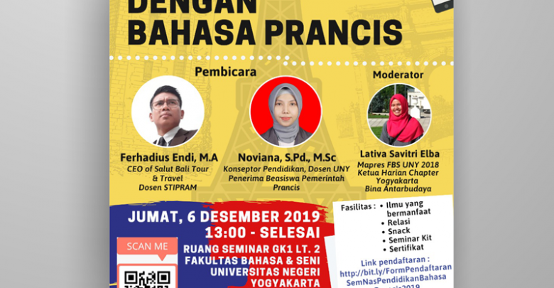 SEMINAR NASIONAL Meniti Karier Dengan Bahasa Prancis 🗓 Jumat, 6 Desember 2019 ⏰ 13.00 WIB – Selesai 🏫 Ruang Seminar lt.2 GK1 FBS UNY Pembicara 🗣 : 1. Ferhadius Endi, M.A (CEO of Salut Bali Tour&Travel, Dosen STIPRAM) 2. Noviana, M.Sc (Konseptor Pendidikan, Dosen UNY, Penerima Beasiswa Pemerintah Prancis) Moderator🙅 Lativa Savitri Elba (Mapres FBS UNY 2018, Ketua Harian Chapter Yogyakarta Bina AntarBudaya) Dengan HTM 💰Rp.30.000 Dapat dibayarkan melalui Transfer BNI 0858434737 a/n Luluk COD…