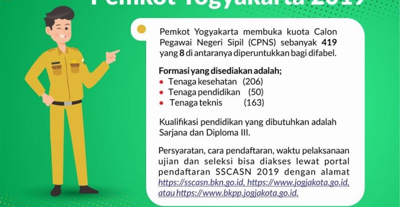 Berdasarkan Keputusan Menteri Pendayagunaan Aparatur Negara dan Reformasi Birokrasi Republik Indonesia Nomor 486 Tahun 2019 tanggal 27 September 2019 tentang Penetapan Kebutuhan Pegawai Negeri Sipil di Lingkungan Pemerintah Kota Yogyakarta Tahun Anggaran 2019, maka Pemerintah Kota Yogyakarta membuka kesempatan kepada Warga Negara Indonesia yang memenuhi syarat untuk menjadi Pegawai Negeri Sipil yang akan ditugaskan di Pemerintah Kota Yogyakarta. Informasi mengenai nama jabatan, kualifikasi pendidikan beserta jumlah kebutuhan dan unit kerja penempatan dapat dilihat dibawah ini…