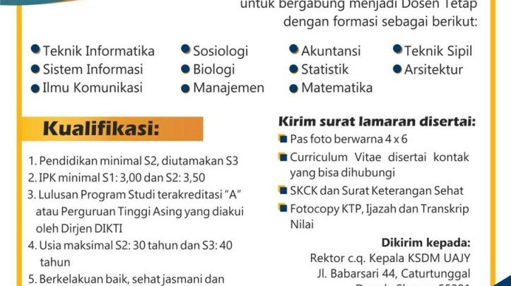 Universitas Atma Jaya Yogyakarta membuka kesempatan berkarir sebagai Dosen Tetap periode November 2019 A. KUALIFIKASI UMUM : Pendidikan minimal S2, lebih diutamakan S3 Usia maksimal S2 = 30 tahun; S3 = 40 tahun IPK minimal 3,00 (S1) dan minimal 3,50 (S2) Dari Perguruan Tinggi dengan Program Studi terakreditasi “A”, atau Perguruan Tinggi Asing yang diakui oleh Dirjen DIKTI Menguasai Bahasa Inggris secara aktif Berkelakuan baik, sehat jasmani dan rohani Belum pernah mengikuti tes calon dosen…