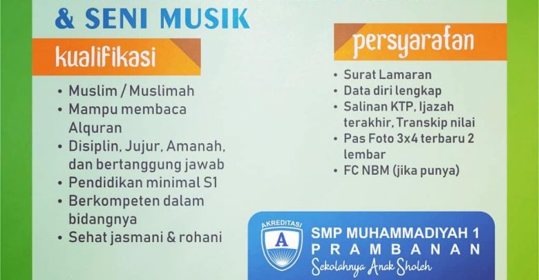 OPEN REQRUITMEN SD Kadipiro 2 membutuhkan guru PAI sebanyak 1 orang dengan syarat 1. Kualifikasi S1 PAI 2. IPK minimal 2,7 3. Dapat membaca Al Qur’an dan Tartil 4. Loyal dan komitmen tinggi 5. Umur maksimal 35 th 6. Laki-laki Kirim berkas lamaran ke SD 2 Kadipiro Cp/Wa: Pak Udin 085866599552
