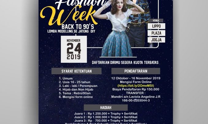 ARE YOU THE NEXT FASHION MODEL? REWIND ORGANIZER Proudly Present ✨✨ [90’s FASHION WEEK] ✨✨ Kamu tertarik dengan dunia fashion? Atau sudah sering ikut event model? Atau pengin ikutan tapi belum ada kesempatan? This is your time. Come and join us : 90’s FASHION WEEK on 24 November 2019 at Lippo Plaza Jogja 📌 Open Registration : 12 Oktober – 16 November 2019 Link Petunjuk Teknis Modelling : https://bit.ly/333tUIv Contact Person ⤵️ 📱Jeje (081293382331) Instagram: @rewind_organizer