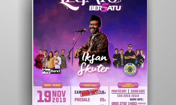 🎊 HIMA PKnH PROUDLY PRESENT 🎊 Malam puncak Dies Natalis Jurusan Pendidikan Kewarganegaraan dan Hukum ke-55 🎼 LEGATO | BER5ATU Dimeriahkan oleh : 1. Iksan Skuter 🎵 @iksanskuterofficial 2. Akd Band 🎵 @akd_band_koplo 3. Play Band 🎵 📆 Date : 19 November 2019 🏣 Venue : Auditorium UNY 🕔 Open gate : 17.00 WIB 💰 Ticket price Earlybird : 18k* *(Sold Out)* Presale : 25k OTS : 35k TIKET TERBATAS INCLUDE ALBUM BARU IKSAN SKUTER +20k…