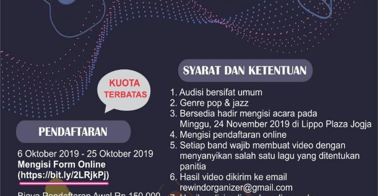 Halo penggemar musik! Salam berkarya 🙌 Kalian punya grup band dan mau band kamu dikenal banyak orang? Rewind Organizer mengadakan “Band Audition” buat kalian yang senang berkarya dan ingin perform di acara keren tahun ini. 😍 Tertarik? Yuk langsung daftarkan band kalian dan ikuti audisinya sesuai syarat dan ketentuan 🎬 Semoga beruntung 📌 Open Registration : 6 Oktober – 25 Oktober 2019 Link Form Pendaftaran Online : https://bit.ly/2LRjkPj Link Petunjuk Pelaksanaan Band Audition : https://bit.ly/2Ou0Ky6…