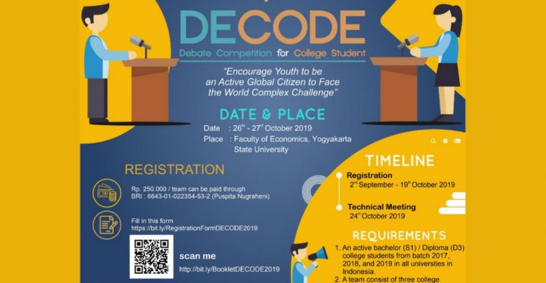 Himpunan Mahasiswa Akuntansi FE UNY proudly present: Debate Competition for College Students “Encourage Youth to be an Active Global Citizen to Face the World Complex Challenge” Sub Theme: 🔹 Social 🔹 Culture 🔹 Environment 🔹 Economic 🔹 Technology Requirements: ▪ An active bachelor (S1) / Diploma (D3) college students from batch 2017, 2018 and 2019 in all universities in Indonesia. ▪ A team consist of three college students from the same university.…