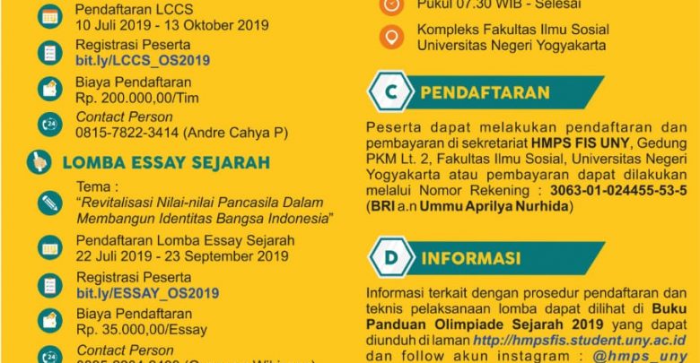 Himpunan Mahasiswa Pendidikan Sejarah Universitas Negeri Yogyakarta mempersembahkan 🌠OLIMPIADE SEJARAH SMA/SMK/Sederajat Tahun 2019🌠 dengan tema “Optimalisasi Peran Sejarah Dalam Penguatan Karakter Pemuda Indonesia” Waktu Pelaksanaan Olimpiade Sejarah SMA/SMK/Sederajat Tahun 2019 🗓️ : Minggu, 20 Oktober 2019 🕢 : 07.30 WIB – Selesai 🏛️ : Kompleks Fakultas Ilmu Sosial Universitas Negeri Yogyakarta . Cabang Lomba Olimpiade Sejarah 2019 🚩 1 LOMBA CERDAS CERMAT SEJARAH (LCCS) SMA/SMK/MA SEDERAJAT Se-JAWA 1 Tim terdiri dari 3 Siswa dan 1…