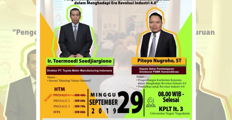 🎉⚙ HIMA OTOMOTIF FT UNY PROUDLY PRESENT ⚙🎉 SEMINAR NASIONAL 2019 Tema : “Pengembangan dan Inovasi Kurikulum Sekolah Kejuruan dalam Menghadapi Era Revolusi Industri 4.0” MODERATOR : 🎤 Afri Yudantoko, S.Pd., M.Pd. (Dosen Pendidikan Teknik Otomotif) PEMBICARA : 🎤 Pembicara 1 (Sisi Pendidikan) Mochammad Widiyanto, S.Pd., M.T (Sub Direktorat Kurikulum Pembinaan SMK) MATERI : ✅ Pengembangan Kurikulum Kejuruan dalam Menghadapi Revolusi Industri 4.0 ✅ Pendidikan untuk Revolusi Industri 4.0 🎤 Pembicara 2 (Sisi Industri) TOERMOEDI…