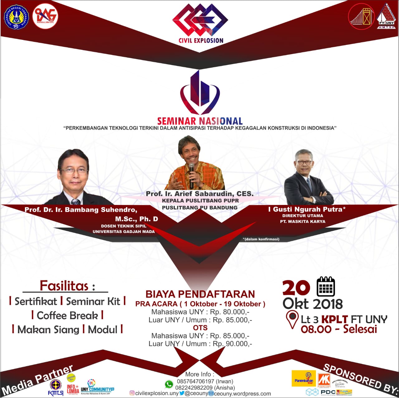Himpunan Mahasiswa Teknik Sipil dan Perencanaan dengan bangga mempersembahkan SEMINAR NASIONAL CIVIL EXPLOSION #6 ” Perkembangan Teknologi Terkini dalam Antisipasi Terhadap Kegagalan Konstruksi di Indonesia ” KEYNOTE Prof. Dr. Ir. Arief Sabarudin, C. ES. (Puslitbang PU Bandung) MATERI KEYNOTEÂ Â Â : Regulasi Pemerintah Guna Meminimalisir Kegagalan Konstruksi di Indonesia PEMBICARA 1. Prof. Dr. Ir. Bambang Suhendro, M.Sc., Ph. D (Dosen Teknik Sipil Univeraitas Gadjah Mada) MATERI PEMBICARA 1Â Â Â : Penerapan Forensic Engineering dalam Analisis Kegagalan Konstruksi…