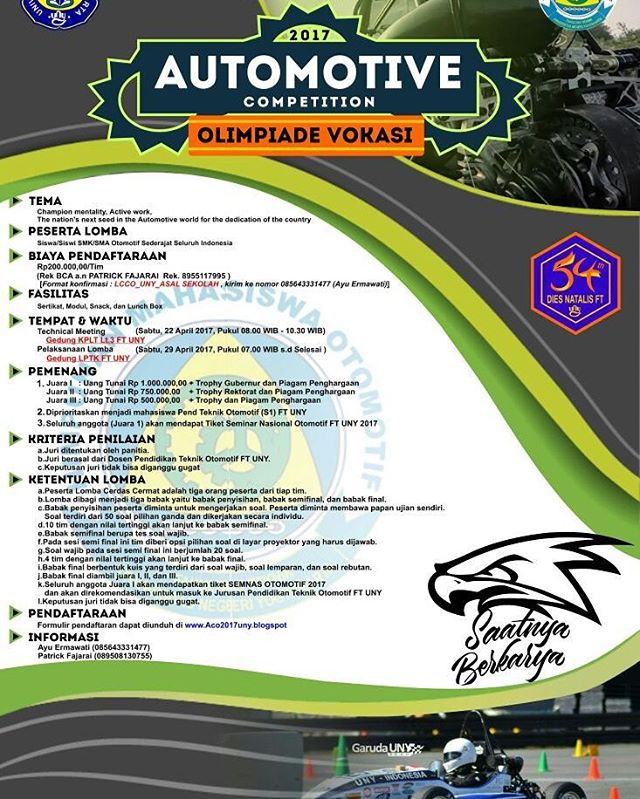 HIMA OTOMOTIF Universitas Negeri Yogyakarta proudly present UNYAutomotive Competition 2017 ⚜ *ACO #17* – *Lcc Otomotif*⚜ *Departement Academic*⚙ ————— merupakan lomba cerdas cermat otomotif dan bagian dari serangkaian acara dari *Dies natalis* *UNY*? Ayo berkompetisi ‼ Sebagai mahasiswa ayo : ? Berjuang ❗ ? Menambah informasi ❗ ?Unggul dan berprestasi *Duaaarrrrrr* :?? ??♂ *LCC Otomotif Nasional serangkaian dari Olimpiade Vokasi 2017*. Tema : ?? *champion mentality, active work, the nation’s next seed in the automotive…