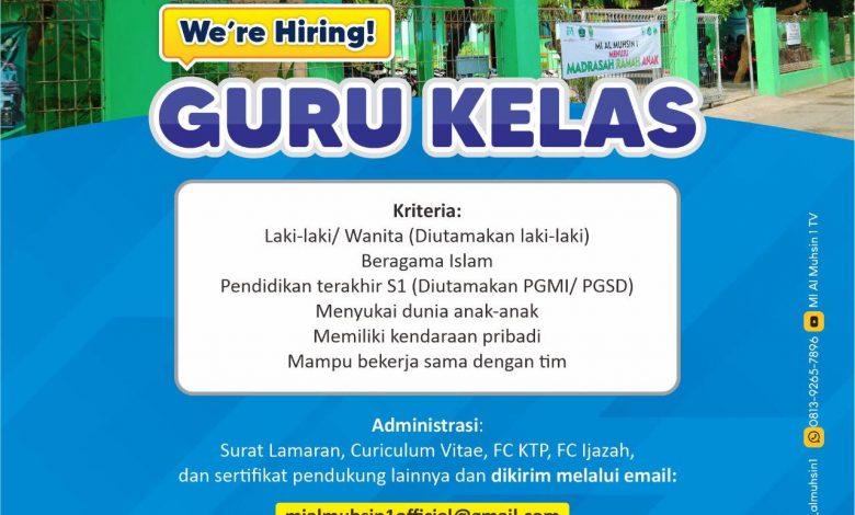 Dibutuhkan GURU KELAS MI AL MUHSIN 1 Alamat: Jl. Parangtritis Km. 3.5 Krapyak Wetan, Panggungharjo, Sewon, Bantul Persyaratan: 1. Pendidikan terakhir Sarjana Pendidikan (Diutamakan PGSD/PGMI) 2. Menyukai dunia anak-anak 3. Muslim/muslimah 4. Memiliki kendaraan sendiri Berkas persyaratan: 1. CV 2. Ijazah dan transkrip nilai 3. Pas foto 3×4 4. Sertifikat pendukung (jika ada) NB Informasi Ustadz Huda: wa.me/6285100831179