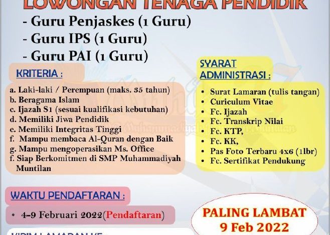 SMP Muhammadiyah Muntilan membuka lowongan pekerjaan untuk Guru dengan posisi Guru Penjakes Guru IPS Guru PAI