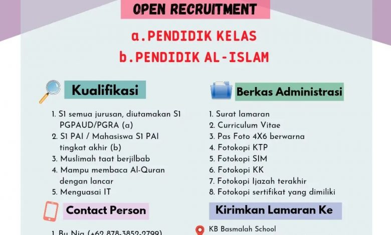 OPEN RECRUITMENT a. Pendidik Kelas b. Pendidik Al-Islam Kualifikasi: 1. S1 semua jurusan, diutamakan S1 PGPAUD/PGRA (a) 2. S1 PAI/Mahasiswa S1 PAI tingkat akhir (b) 3. Muslimah taat berjilbab 4. Mampu membaca Al-Qur’an dengan lancar 5. Menguasai IT Kirim CV via email ke basmalahschool2008@gmail.com (konfirmasi ke narahubung apabila sudah mengirim berkas) atau bisa datang langsung ke KB Basmalah School setiap hari Senin-Sabtu (09.00-12.00 WIB) JOIN WITH US 🤗🤗 Share dan tag ke teman-teman kalian 😊😊…