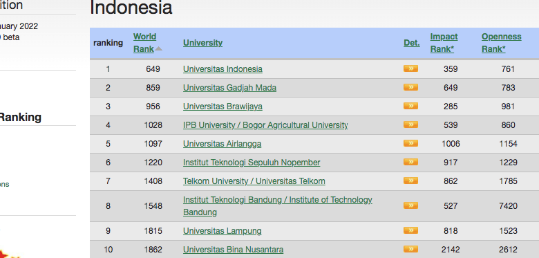 Webometric adalah suatu sistem yang memberikan penilaian terhadap seluruh universitas terbaik di dunia melalui website universitas tersebut. Webometric melakukan pemeringkatan terhadap lebih dari 22 ribu Perguruan Tinggi diseluruh dunia. Ada 3 komponen yang menjadi indikator utama dari penilaian Webometrics ini, yaitu: Visibility, Transparancy dan Excellence Dengan komposisi penilaian VISIBILITY : 50% , TRANSPARENCY (or OPENNESS) 10%, EXCELLENCE (or SCHOLAR) 40% Berikut adalah Webometrics Ranking yang dicapai Perguruan Tinggi Indonesia ranking World Rank University Impact Rank* Openness…