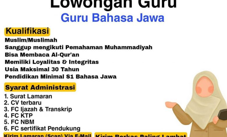 Dibutuhkan tenaga pengajar sebagai guru Bahasa Jawa di SMP Muhammadiyah 10 Yogyakarta Dengan kualifikasi seperti yang tertera di pamflet Untuk info lebih lanjut silahkan menghubungi Bu Winda (08812634379) Pak Nur (085747343330)