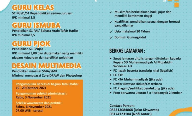 LOWONGAN GURU & KARYAWAN SD MUH. AL MUJAHIDIN WONOSARI* Diumumkan kepada seluruh umat Islam bahwa SD Muhammadiyah Al Mujahidin membutuhkan : A. Guru ▫️ Guru Kelas ▫ Guru Ismuba ▫ Guru Olahraga B. Staff IT ▫️ Desain Multimedia 📝 *Persyaratan : 1⃣ Muslim atau muslimah berkelakuan baik, memiliki komitmen tinggi, mampu bekerjasama dalam tim dan lancar membaca Al Qur’an. 2⃣ Memiliki kualifikasi pendidikan sbb: 🔹Guru Kelas : S1 PGSD atau S1 Kependidikan semua jurusan IPK…