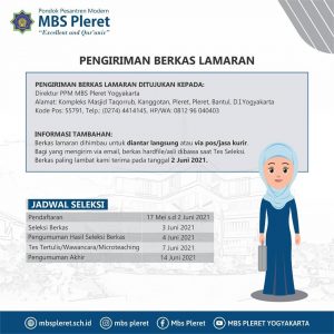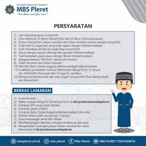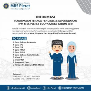 Pondok Pesantren Modern Muhammadiyah Boarding School Pleret Bantul Yogyakarta membuka kesempatan untuk Ta’awun (bekerja sama) dalam bidang pendidikan dengan posisi sebagai: Guru, Karyawan dan Musyrif/ah (Pembimbing Asrama).